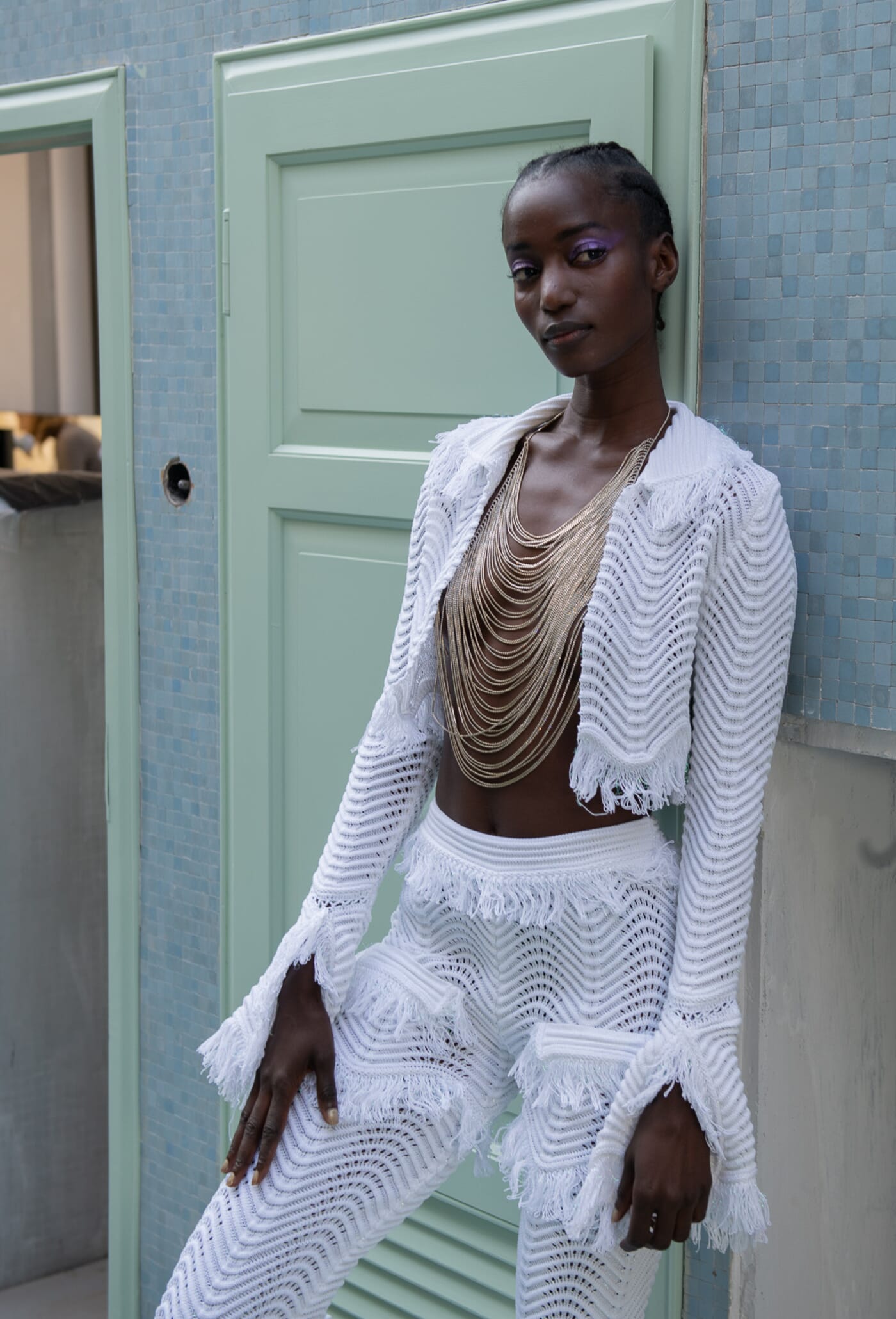 A summery vibe is conjured up by fringed jacquard fabrics, in jackets with a fresh toweling wrap effect.